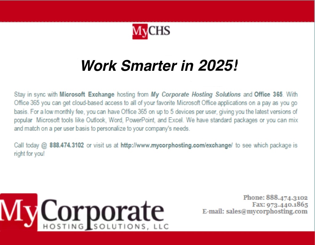 Looking for something more robust than Small Business mail hosting? Ask us about Microsoft Exchange Hosting. MyCHS has a number of packages available with add-ons such as Sharepoint, Office Bundling, and Lync.